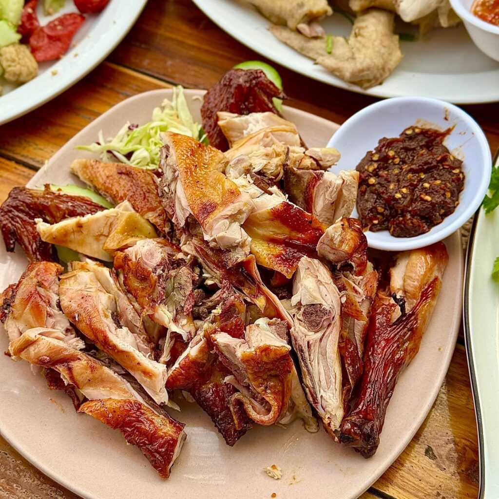 Another must-try dish is Lao grilled chicken, locally known as Ping Kai. The chicken is marinated with garlic, fish sauce, herbs, and local spices before being grilled slowly over charcoal. This traditional Lao grilling method gives the chicken a smoky flavor and crispy skin while keeping the meat tender inside.