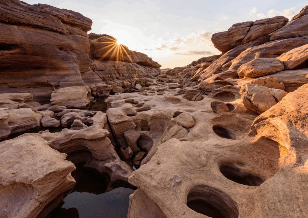 The island’s defining feature is the way the Mekong River has shaped it over thousands of years. Large and small stones lie naturally across the surface, layered and scattered by the force of water. Between these rocks, narrow streams flow through natural corridors, creating movement and soft sounds that change with the seasons. In some areas, small trees and plants grow between the stones, adding contrast and color to the rocky terrain. When viewed from higher ground, parts of the island resemble natural sculptures, formed entirely by erosion and time.